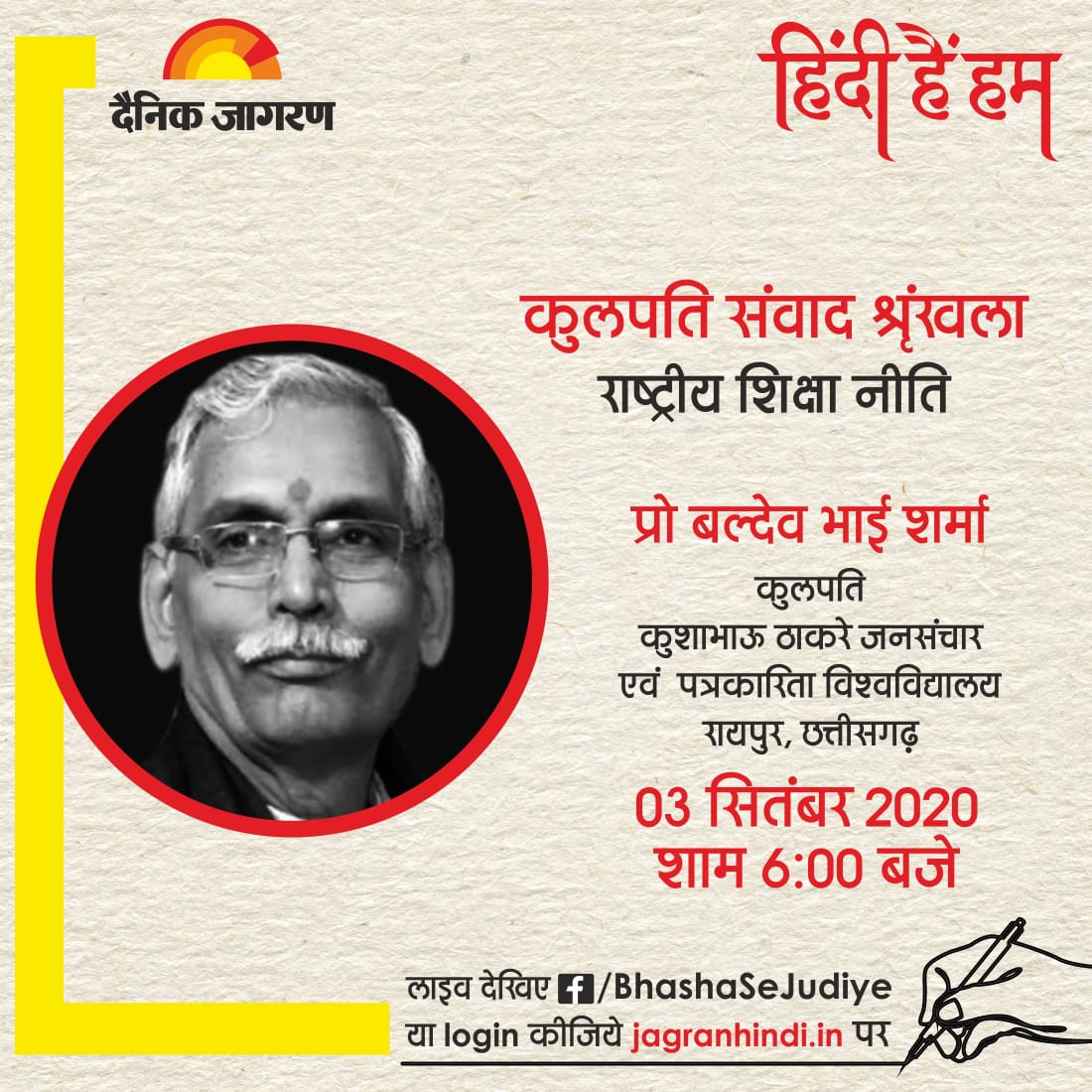 कुलपति संवाद श्रृंखला : राष्ट्रीय शिक्षा नीति में प्रो बल्देव भाई शर्मा, कुलपति, कुशाभाऊ ठाकरे जनसंचार विश्वविद्यालय,रायपुर, छत्तीसगढ़ के साथ 3 सितंबर 2020, शाम 6 बजे से