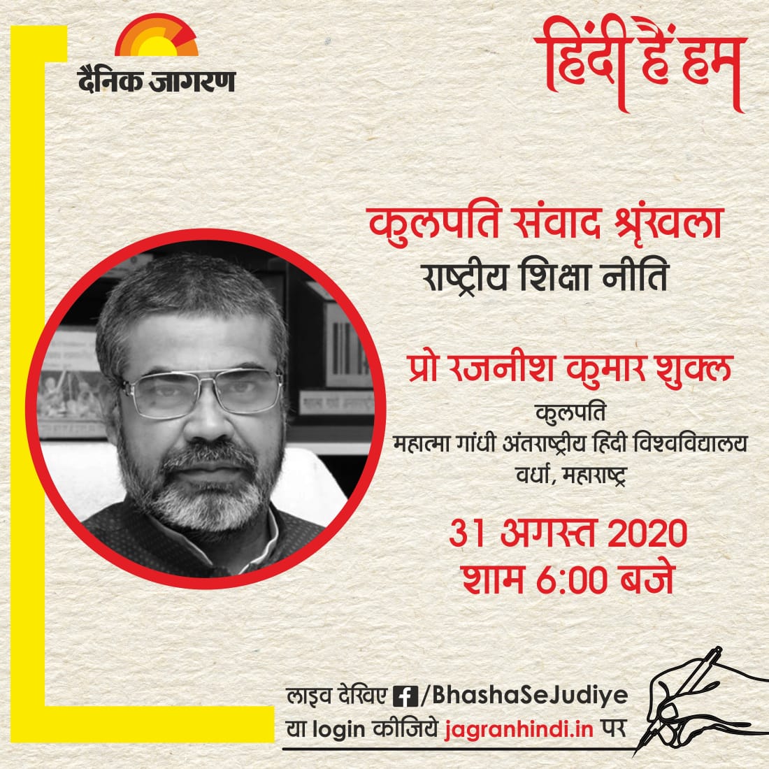 दैनिक जागरण हिंदी हैं हम अभियान के अंतर्गत कुलपति संवाद श्रृंखला : राष्ट्रीय शिक्षा नीति- भाषा और संस्कृति में प्रो रजनीश कुमार शुक्ल, कुलपति, महात्मा गांधी अंतरराष्ट्रीय हिंदी विश्वविद्यालय, वर्धा के साथ 31 अगस्त| शाम 6 बजे से सीधे जुड़ें www.jagranhindi.in पर