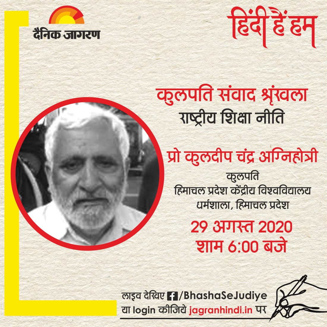 दैनिक जागरण हिंदी हैं हम अभियान के अंतर्गत कुलपति संवाद श्रृंखला : राष्ट्रीय शिक्षा निति में प्रो कुलदीप चन्द्र अग्निहोत्री के साथ 29 अगस्त | शाम 6 बजे से
